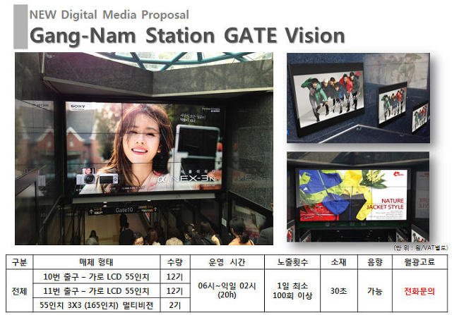 오늘 소개해드릴 강남역 게이트비젼 이라 불리우는 지하철역사광고 매체는 강남역에서 가장 유동인구가 많은 10번,11번 출구에 설치된 스틸컷으로 운영되는 동영상광고 매체 입니다. 즉 광고가 영상물로 표출되는것이 아닌 스틸컷으로 일정시간 표출되는 형태로 운영되고 총 20구좌 (20개 광고주)로 운영 되는 형태 입니다.