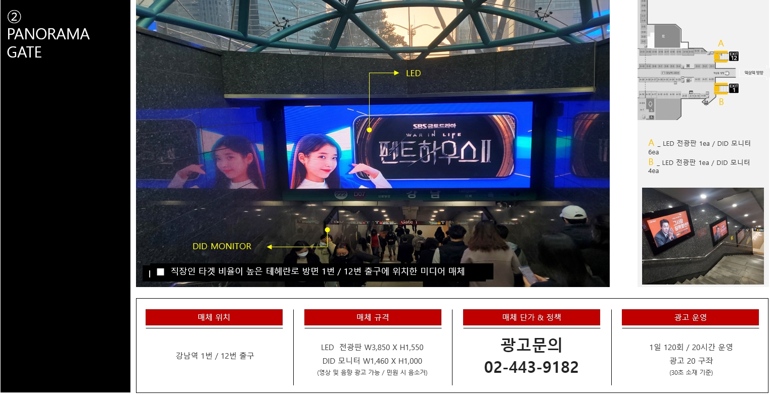 그리고 강남역 광고 에서도 직장인 유동인구 비율이 높은 테헤란로 1번 및 12번에 출구에 위치한 파노라마게이트 지하철역광고는 전면에 대형전광판이 설치되어있고 측면은 디지털포스터 크기 사이즈의 10개 정도 DID패널이 설치되어 있습니다. 영상및 음향도 가능한데요 민원시 음소거 할수있으니 참고하시구요. 이곳도 총 20개 구좌의 영상이 돌아가면서 표출되고 1개 구좌당 하루 20시간 운영에 1일 120회 입니다.