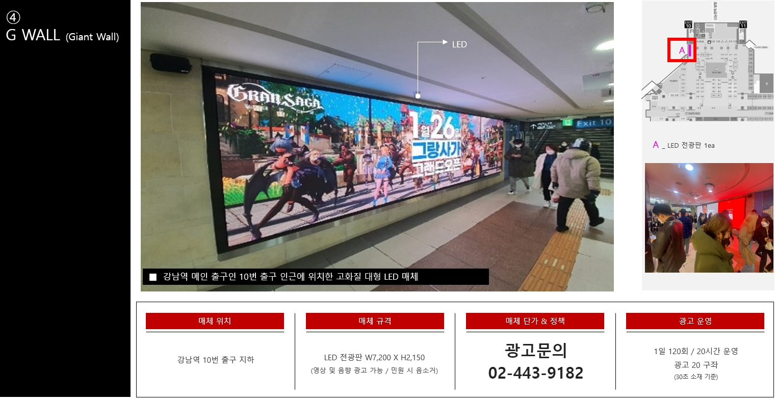 유동인구가 가장 많은 10번출구에는 자이언트월 이라는 가로사이즈가 7.2 M에 이르는 정말 자이언트한 벽면 LED매체가 설치 되어있습니다. 유동인구가 가장 많기에 쇼핑몰내에서 가장 핫한 영상매체중 하나입니다. 전체적인 표출횟수와 운영시간 집행조건은 다른 매체와 동일합니다.