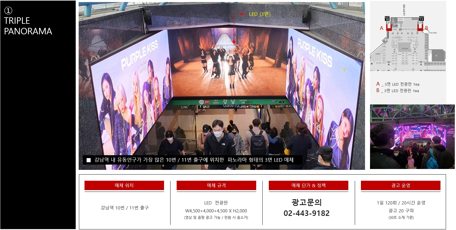 강남역광고 중에서 가장 유동인구가 많은 10,11번 출구에 위한 트리플파노라마 매체는 3면이 LED 로 이루어진 파노라마 형태의 매체입니다. 사이즈가 무려 가로 4.5 M 세로 4M 정도의 이 출구를 지나는 사람들은 반드시 볼수밖에 없는 거대한 크기로서 사람들을 압도합니다. 전광판이다 보니 약 20개의 영상이 돌아가면서 나오는 형태 이구요 하루 20시간 운영 되고 1개 브랜드별로 1일 120여회 정도 표출 됩니다.