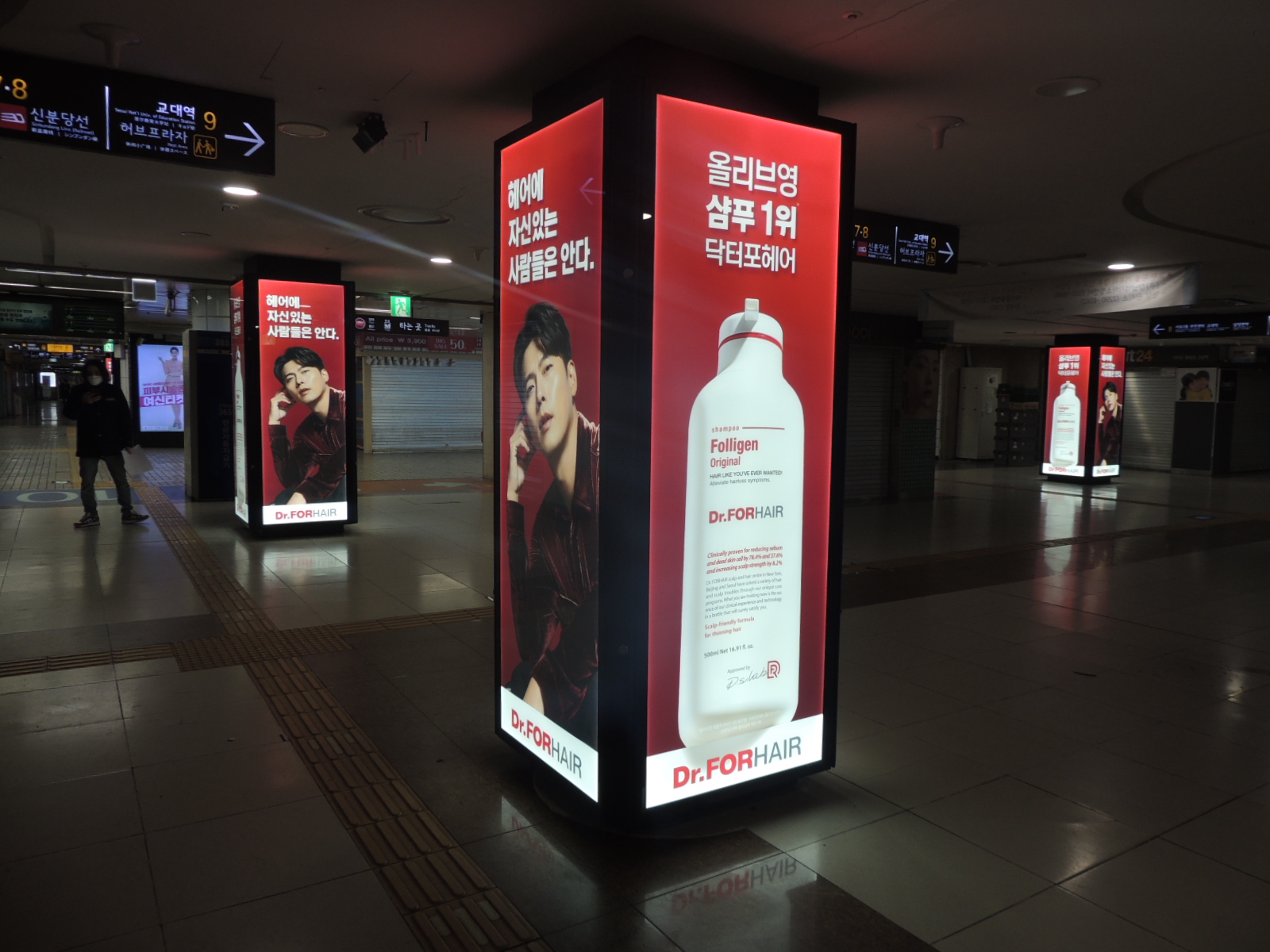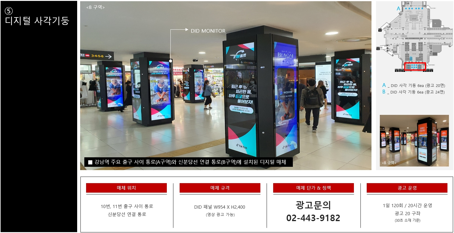 유동인구가 많이 몰리는 출구인 10번 11번 출구사이 통로와 신분당선 연결통로에 위치한 디지털사각기둥은 4면이 DID 패널로 구성되어 있고 총 6개 기둥이 한패키지로 구성되어 총 20개 구좌로 구성되어 다양한 브랜드CF가 돌아가면서 표출되는 형태 입니다.